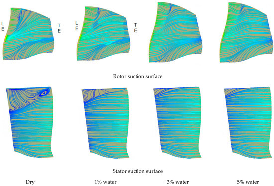 Figure 15 shows the limit flow diagram of the suction surface of the first-stage blade of the compressor. Compared with the dry compression condition, the flow separation area of the rotor and stator suction surface of the compressor is significantly reduced after rain absorption, and the flow field of the compressor is improved, so that the compressor enters the stable condition from the stall condition. The larger the suction amount, the smaller the separation zone on the suction surface of the blade. When the absorption rate is 3%, the separation zone on the first stator has disappeared.