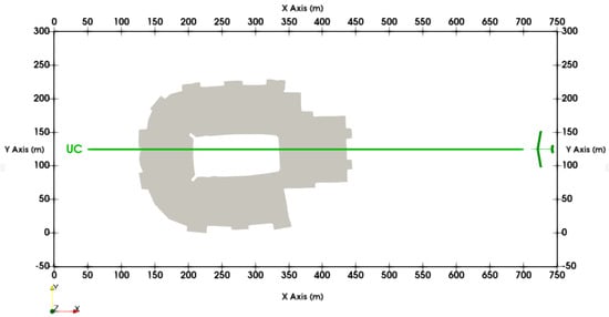 The nominal path of each aircraft through every wind field (Full-Order Model (FOM), 80%, 50%, and mean) resembles Figure 1 for all initial altitudes ranging from 45 m to 100 m. The mean wind field is the temporal average at each location in the FOM wind field, Equation (11). Spatial variation still exists for the mean wind field, and this case represents a Reynolds-averaged Navier–Stokes (RANS) representation. This case was included to further support the conclusions from the author’s previous effort [23]. It should be noted that the upper extent of the stadium is 40 m. This flight path is designated as UC (Upstream, Center) because the aircraft navigates upstream relative to the direction of the bulk flow. The starting location was chosen as it proved to be the most active and impactful of the locations studied in the previous efforts of the authors [23].