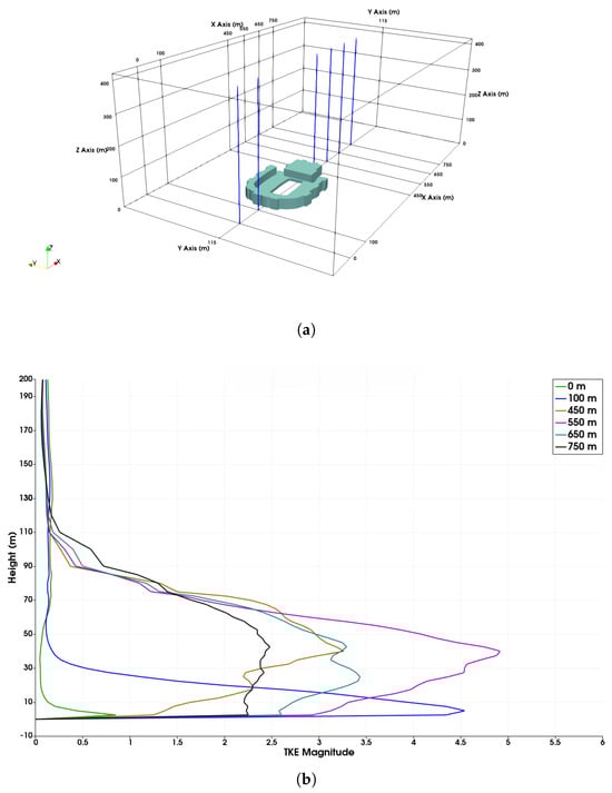 Altitude determination using TKE metric. (a) A 3D view depicting the x-locations where line data was sampled relative to the building. (b) Average TKE along the height at various x-locations on the center of the domain (nominal flight path).