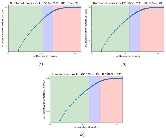 Number of cut-off modes for RIC values 50% and 80%; Green—modes until 50%, Purple—modes from 50% to 80%, Red—neglected modes. Found for various velocity compenents: (a) u-velocity, (b) v-velocity, and (c) w-velocity.