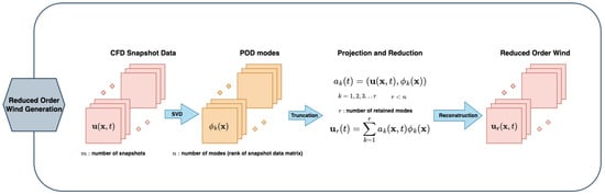 Traditional turbulence models are not capable of representing the atmospheric dynamics in dense urban areas, especially phenomena due to interference effects from large obstructions like buildings or other artificial topographical features. Instead, well-known continuous and discrete gust models such as the von Karman and Dryden models aim to assess the vehicle in open-air flight [11]. Without readily available wind field models for urban environments, an alternative lies in using numerical simulations to capture wind fields around urban structures and the resulting interaction with an aircraft platform, especially within the atmospheric boundary layer. However, numerical simulations pose computational challenges associated with real-time predictions for operating AAM air vehicles. In contrast, reduced-order models (ROMs) or surrogate models are designed to approximate data from numerical simulations at reasonable accuracy [12,13]. These models and their extensions could enable both generating realistic wind data [14,15,16] for testing [17] and for predicting wind data using techniques like machine learning [18]. The Proper Orthogonal Decomposition (POD) method is widely used for extracting the richest modal information from a set of time-series data from experiments or simulations [19,20]. These modes can be used to obtain lower-dimensional dynamic models [21,22]; hence, this method was used to generate the reduced-order wind.