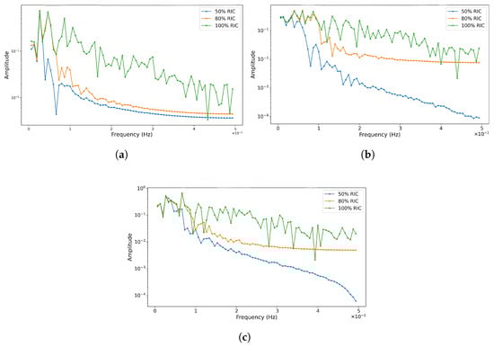 The amplitude versus frequency plots for three velocity components at an x-location of 550 m at an altitude of 60 m, corresponding to the full-order, 80%, and 50% RIC cases, are presented in Figure 5. The x-location is downstream of the building and lies on the nominal path shown in Figure 1. Fast Fourier Transform (FFT) was used to compute the amplitude and frequency of the velocity data at that location over the full time period of 150 s. Notably, reduced information content results in the loss of higher frequency information in the wind field.