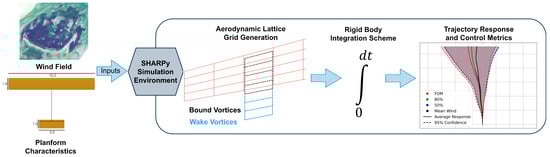 SHARPy incorporates an integration scheme to advance the models through wind fields, which has been used to generate the results presented here. A more detailed explanation of SHARPy’s application in propagating an aircraft through a Large Eddy Simulation (LES) field can be found in Ref. [9]. However, for the purposes of this paper, the structure is rigid, simplifying the notation. A summary of the simulation environment is shown below in Figure 6.
