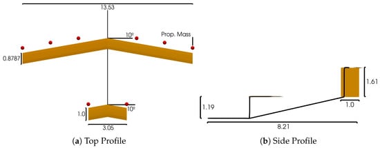 An Advanced Air Mobility (AAM) platform, initially described by NASA [2,40], is adopted as the high wing-loaded configuration for this exercise. This platform was represented in SHARPy in the previous efforts by the authors, [23], the findings that motivate this study. Results for the NASA AAM concept are presented at 45 m and 100 m altitudes. The previous results were only obtained at 60 m. In the current study, the initial condition at 60 m altitude was re-evaluated under comparable wind conditions, yielding similar overall trajectory response characteristics as reported earlier. The locations of lumped mass representations of the propulsion system are incorporated into the model and are shown in Figure 7. Table 2 summarizes the mass properties, assumed initial airspeed, and the airfoils for each aerodynamic surface.