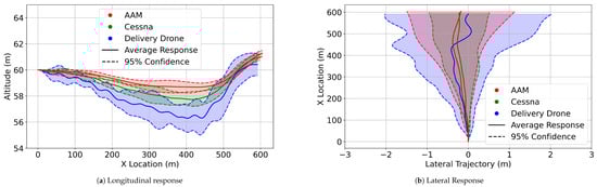 The most significant differences in longitudinal trajectories among the configurations were observed at an altitude of 60 m. Confidence intervals for these trajectories through the FOM wind field are illustrated in Figure 10. The responses of each configuration to the various wind fields (FOM, 80%, and 60%) at altitudes of 45 m, 60 m, and 100 m are shown in the following sections.