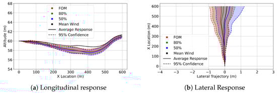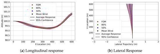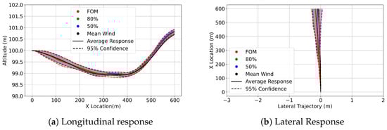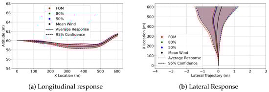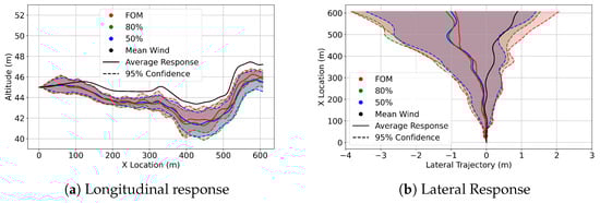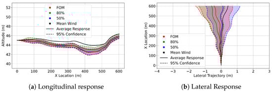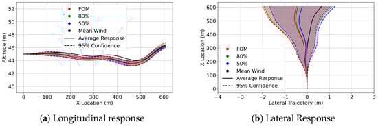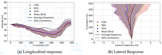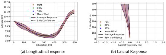 At 100 m, the highest altitude in this study, it is observed from Figure 17, Figure 18 and Figure 19 that the influence of the wind fields has greatly diminished. This is shown in the longitudinal and Lateral Responses, which feature more narrow and concentrated flight paths.