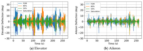 Table 6 and Table 7 present the standard deviations of the control surface activity for elevators and ailerons for every altitude, configuration, and wind field. The standard deviation of control deflections throughout a maneuver’s time history serves as a measure of control activity [44] and is an additional way to compare the responses of the configurations across the FOM and ROM wind fields. For the three aircraft models, control saturation for the elevator and aileron is taken as a deflection off of the neutral condition. In the simple feedback models utilized, no deflection is applied beyond this threshold.