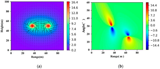 As the A320 passes, its wake vortex causes aerosol particles in the air to move. The flow field and velocity intensity of these aerosol particles are depicted in Figure 3a. When the LiDAR scans the vortex at the origin in Figure 3a, let’s consider an aerosol particle located at point P, whose coordinates can be expressed as where denotes the horizontal distance from the radar to point P, and is the elevation angle of point P. The radial velocity is given by Equations (3) and (4).