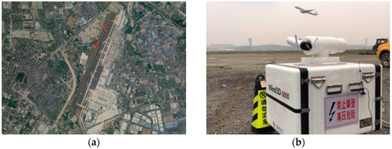 In this experiment, Wind3D 6000 LiDAR (Qingdao Leice Transient Technology Co., Ltd., Qingdao, China) was used to collect aircraft wake vortex data, enabling detection over longer distances. The maximum detection radius exceeds 6 km. It features a small size, is lightweight, and has low power consumption. Figure 4a depicts the operation of the LiDAR equipment. Table 2 lists the equipment parameters of Wind3D 6000. The experimental site was near Shuangliu International Airport, as shown in Figure 4, which displays a satellite image of the airport with the detection locations marked. Considering factors such as airport terrain, weather conditions, and runway operations, the LiDAR parameters were set as shown in Table 2.