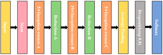 The size of images in pixels is 48 × 56 × 3. As shown in Figure 6, the Inception-ResNet-v2 network combines the Inception architecture with residual connections, offering efficient computation and demonstrating high performance in image recognition tasks. The network consists of several types of modules, each designed to handle features at different scales. The Stem module serves as the entry point of the network and is responsible for initial feature extraction through three 3 × 3 convolutions and pooling layers. The Inception-ResNet-A module combines various convolution operations and residual connections to capture fine-grained features, including 1 × 1 convolutions, 3 × 3 convolutions, and 7 × 1 and 1 × 7 convolutions, which are combined through the Inception feature concatenation layer. The Reduction-A module reduces spatial dimensions while increasing the depth of the feature maps, facilitating the processing of more abstract features in deeper layers. Its core operation involves 3 × 3 convolutions and max pooling to decrease spatial dimensions. The Inception-ResNet-B module is similar to the Inception-ResNet-A module but is configured differently to capture mid-level features, including more 7 × 1 and 1 × 7 convolutions, focusing on capturing more complex patterns. The Reduction-B module further reduces spatial dimensions, preparing the network for the final stage, shrinking the spatial dimensions to 5 × 6 while increasing the depth to 1152 through 3 × 3 convolutions and max pooling. The Inception-ResNet-C module acts as the network’s final convolutional operation, capturing high-level features and refining the feature maps through a series of 1 × 1 and 3 × 3 convolutions to produce the final output.