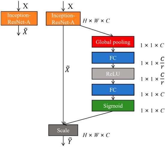 To enhance the feature representation ability of the Inception-ResNet-v2 network, allowing it to adaptively weight different feature channels, the SE module can be inserted after each Inception module (Inception-ResNet-A, B, C modules). Take the Inception-ResNet-A module as an example, as shown in Figure 7.