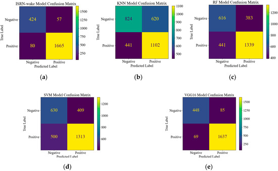 To further evaluate the performance of the models in binary classification tasks, we calculated the confusion matrix for each model and conducted an in-depth analysis of their classification capabilities across different categories. As shown in Figure 10, the results indicated that deep learning models, such as VGG16 and ISRN-wake, performed exceptionally well in these tasks, especially in situations where the ratio of positive to negative samples was imbalanced. Although traditional machine learning models like SVM, KNN, and RF also showed good performance, they exhibited some limitations in balancing precision and recall.