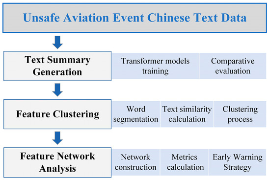 The rapid growth of the aviation industry highlights the need for strong safety management. Analyzing data on unsafe aviation events is crucial for preventing risks. This paper presents a new method that integrates the Transformer network model, clustering analysis, and feature network modeling to analyze Chinese text data on unsafe aviation events. Initially, the Transformer model is used to generate summaries of event texts, and the performance of three pre-trained Chinese models is evaluated and compared. Next, the Jieba tool is applied to segment both summarized and original texts to extract key features of unsafe events and prove the effectiveness of the pre-trained Transformer model in simplifying lengthy and redundant original texts. Then, cluster analysis based on text similarity categorizes the extracted features. By solving the correlation matrix of these features, this paper constructs a feature network for unsafe aviation events. The network’s global and individual metrics are calculated and then used to identify key feature nodes, which alert aviation professionals to focus more on the decision-making process for safety management. Based on the established network and these metrics, a data-driven hidden danger warning strategy is proposed and illustrated. Overall, the proposed method can effectively analyze Chinese texts of unsafe aviation events and provide a basis for improving aviation safety management.