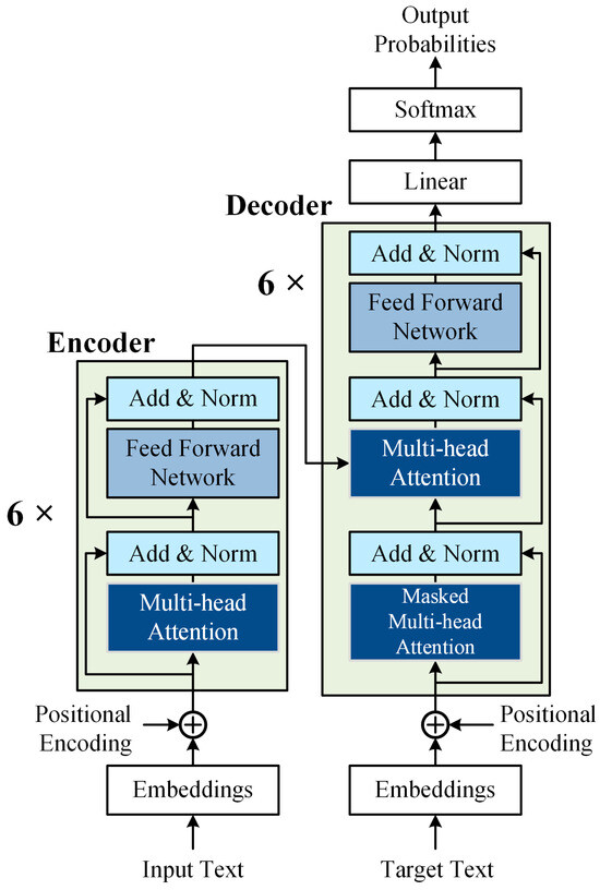 The Transformer model, introduced by Vaswani et al. in 2017 [15], is distinguished by its self-attention mechanism, which enables the model to capture dependencies between any two positions in a sequence, regardless of the distance between them. This effectively addresses the vanishing or exploding gradient issues encountered by traditional Recurrent Neural Networks (RNNs) when processing long sequences. The structure of a typical Transformer model is shown in Figure 2.