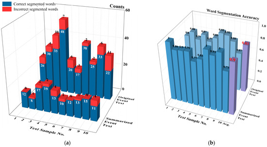 Word segmentation results of original and summarized event texts: (a) Word segmentation counts; (b) Word segmentation accuracy. The highlighted numbers in red are the average accuracy.