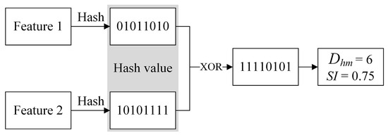 From Equation (5), it can be inferred that the larger the Hamming distance Dhm between the features, the lower their similarity (SI) will be. Figure 4 shows an example of calculating the similarity of two features using Hash mapping.