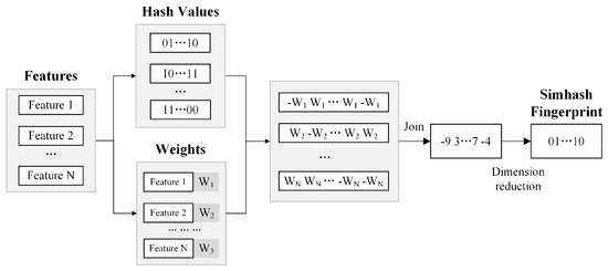 The Simhash algorithm is a widely used technique for simplifying text data by reducing its complexity [25,26,27]. It works as a type of hashing method that is sensitive to the content’s locality. The process starts with basic text preparation, like breaking down the text into words, to get the main parts of the text and how important each part is. The importance is measured by a common method called Term Frequency-Inverse Document Frequency (TF-IDF) [5].