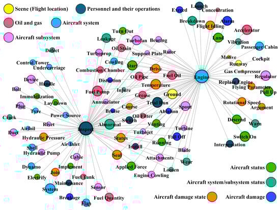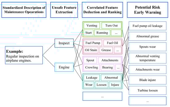 As illustrated in Figure 8, when implementing regular maintenance inspection on airplane engines, the standardized description is “Regular inspection on airplane engines”, then the features extracted of this operation are “Inspect” and “Engine”. Through the feature network, those features that both connected with “Inspect” and “Engine” were determined, as shown in Figure 9. Considering the individual metrics of these features, the ranking of them can be realized. According to the ranking of these unsafe features and their classifications, potential risk information can be specified. In this example of Figure 8, when implementing regular inspection on airplane engines, the following potential risks should be paid more attention to: oil leakage of the fuel pump, grease abnormality, wearing spouts and attachments, abnormal venting temperature, and so on.