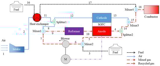 The FCPS structure is shown in Figure 1. The system consists of a heat exchanger, a separator, a mixer, a reformer, an SOFC, a blower, and a motor. The black lines indicate the fuel flow, the blue lines indicate the airflow, the long-drawn-dotted red lines indicate the mixture flow, and the long-drawn red lines indicate the anode recirculation flow. The working process is as follows: Firstly, the incoming air is compressed by the intake and then enters the heat exchanger for cooling. The cooled air is subsequently divided into two streams by splitter-1; one stream enters the reformer to participate in the reforming reaction, while the other stream proceeds to the SOFC cathode to supply oxygen for the electrochemical reaction. The airflow rate is contingent upon the OCR and SOFC operating temperatures. Secondly, the anode recirculation gas is mixed with fuel and then compressed by a blower to compensate for the pressure loss. The flow rate of the anode recirculation gas is dependent on the SCR. The blower is driven by a motor that is powered by the SOFC. Subsequently, the air, fuel, and steam undergo an autothermal reforming reaction within the reformer, wherein larger fuel molecules are converted into smaller gas molecules predominantly composed of hydrogen (H2). It should be noted that the steam content in the reformer should not be too low to avoid serious carbon deposition affecting the reforming efficiency [35]. Finally, the hydrogen-rich reformed gas is introduced into the SOFC anode, where it undergoes both internal reforming and electrochemical reactions to produce electrical energy. The exhaust from the SOFC is then directed into the combustion chamber to mitigate the impact of the power generation system’s air draw on combustion efficiency.