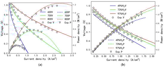 The results of the SOFC model validation. (a) The different operating temperatures and (b) the different fuel concentrations. (Note: The “600 V” in the figure represents the SOFC operating voltage when the SOFC operating temperature is 600 °C).