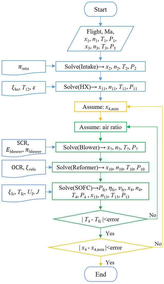 The computational logic of the FCPS is shown in Figure 3. Firstly, the system parameters are initialized, including the flight altitude, flight Mach number, fuel tank parameters, pressure recovery coefficients of each component, SOFC cathode inlet temperature, OCR, fuel utilization, and current density. Secondly, after completing the calculations for the intake and heat exchanger components, the SOFC anode outlet parameters and SOFC excess air coefficient are guessed, and the calculations for the blower and reformer components are executed to obtain the SOFC inlet parameters. The parameters required for the heat exchanger include the pressure recovery coefficient, the effectiveness, and the temperature of node 12. For the blower, the necessary inputs are the efficiency, pressure ratio, and SCR. The reformer requires the pressure recovery coefficient and OCR as input parameters. Thirdly, the SOFC internal reforming equations, electrochemical equations, and energy balance equations are solved to obtain the SOFC operating temperature and outlet parameters. The parameters required for the SOFC include the pressure recovery coefficient, operating temperature, fuel utilization, and current density. The iteration parameters include the SOFC operating temperature and SOFC anode recirculation gas composition, and the iteration ends when the error between the calculated and set values reaches an acceptable range. Finally, when the system is in steady state operation, the FCPS performance parameters such as SOFC voltage, power, and electrical efficiency are output. In Figure 3, the green color represents the iterative process for the SOFC operating temperature, the yellow color represents the iterative process for the SOFC anode recirculation gas composition, and the blue color is used to distinguish the first two colors.