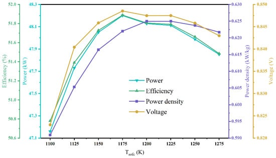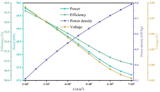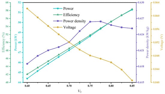 Figure 4 shows the trend of the FCPS performance as the fuel utilization is transformed from 0.6 to 0.85. From the figure, it can be seen that as the fuel utilization increases, the FCPS electrical efficiency and power increase, the power density increases and then decreases, and the voltage continues to decrease. When the fuel utilization increases, more fuel is utilized by the SOFC, and the electrical efficiency and power increase, but the increase in fuel utilization will also make the average mole fraction of hydrogen and oxygen inside the SOFC decrease, causing a decrease in the Nernst voltage. In addition, when the fuel utilization increases, it is necessary to increase the SOFC activation area and pass more air to the SOFC cathode to maintain the SOFC operating temperature, which will make the weight of the SOFC and heat exchanger components increase, resulting in a situation where the power density appears to decrease.