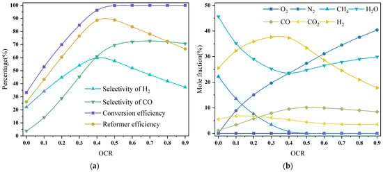 The reformer performance evaluation indices include selectivity of H2, selectivity of CO, conversion efficiency, and reformer efficiency. The specific calculation methods are shown in Equations (24)–(27).