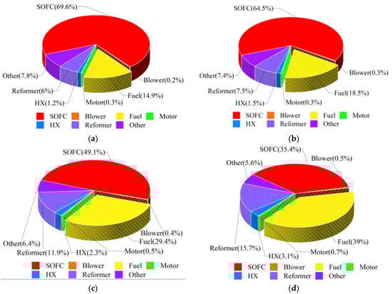 From Table 10 and Figure 10, it can be concluded that the exergy loss in the heat exchanger is 0.49 kW, attributed to the higher operating temperature of the SOFC under the design conditions, the low excess air coefficient of the SOFC, and the minimal air flow rate involved in the heat exchange process. The exergy loss of Mixer-1 and Mixer-2 are 0.13 kW and 1.78 kW, respectively, and the exergy loss of Mixer-2 is greater due to the complex mixture composition and larger entropy increase as the anode recirculation gas and fuel are mixed for the first time in Mixer-2. The reformer exergy loss is 2.84 kW. The exergy loss of autothermal reforming mainly comes from an incomplete chemical reaction and carbon deposition that causes pressure loss and catalyst degradation [35]. The SOFC exergy loss is 9.62 kW. The SOFC, based on the Gibbs free energy principle, has a high power generation efficiency, but there is still a large exergy loss in the SOFC due to the polarization loss and incomplete internal reforming. The exergy loss of the blower is 0.29 kW. This loss can be attributed to several irreversible processes occurring within the blower, including friction loss and dynamic pressure loss, which result in an exergy efficiency of only 65.72%. In addition, the exergy loss associated with the SOFC constitutes 63.49% of the total loss, while the exergy loss from the reformer accounts for 18.75% of the total loss. The exergy loss of the two accounts for 82.24%.