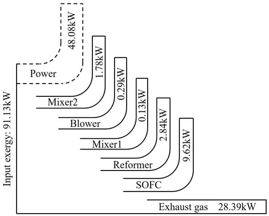 Figure 11 is the exergy flow diagram of the FCPS. From the figure, it can be seen that the fuel input exergy is 85.22 kW, the motor input exergy is 0.84 kW, the reformer air input exergy is 3.88 kW, and the SOFC cathode air input exergy is 1.22 kW, of which 48.08 kW is converted to useful work by the SOFC, and the system exergy efficiency is 55.86%. The exergy value of the uncirculated exhaust gas from the SOFC anode is 28.39 kW. Considering that the subsequent exhaust gas will be introduced into the combustion chamber, the exergy efficiency is expected to be further improved.