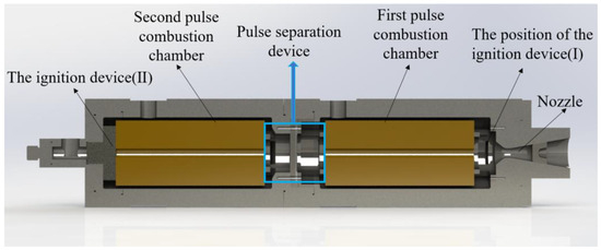In recent years, human activities in space have increased. The successful development of various types of artificial satellites, space stations, probes, and other spacecraft is closely related to solid rocket motors [1,2]. A development trend of modern spacecraft is miniaturization. The use of small solid rocket motors can greatly reduce the mass occupied by the propulsion system, which offers advantages such as high mass ratio, high impulse-to-mass ratio, high safety, and low cost [3,4]. Small thrusters have great potential for future applications [5]. Small double-pulse solid rocket motors utilize pulse separation devices (PSDs) for interstage isolation of the combustion chambers. PSDs divide the combustion chamber into two distinct chambers, each with an independent ignition device. By adjusting the thrust distribution and the interval between the two-stage pulses, the spacecraft’s flight trajectory can be better controlled and the motor energy better managed [6,7,8]. Additionally, double-pulse motors can be used to fly mission-adapted trajectories [9].