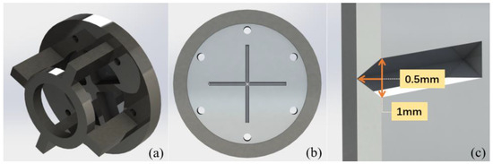(a) The structure of the cross-support frame; (b) the metal diaphragm plate (pulse I view); (c) the dimensions of the V-grooves.