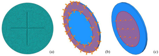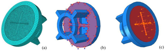 (a) The mesh model; (b) the boundary condition; (c) the working load of the diaphragm.