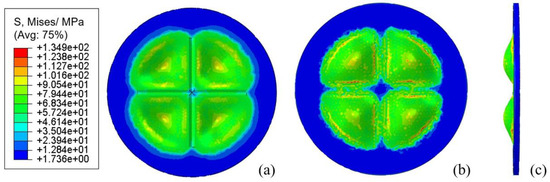 Von Mises stress contour plot of the metal diaphragm: (a) pulse I view; (b) pulse II view; (c) lateral view.