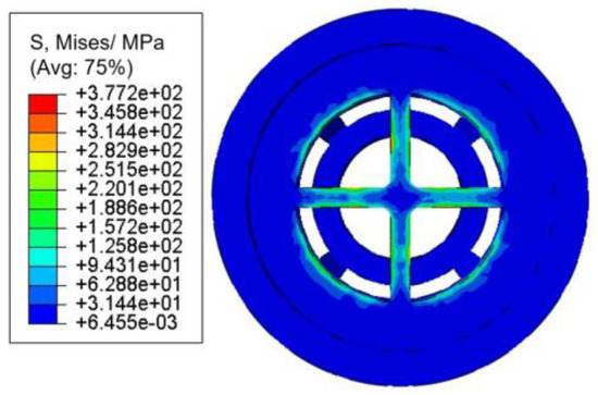 The stress distribution obtained from the simulation is shown in Figure 4 and Figure 5. Under a compressive load of 11 MPa, the maximum stress in the metal diaphragm was 139 MPa. This peak stress was primarily located at the root of the load application region and the depression. The maximum stress in the support frame was 377 MPa. This occurred at the cross and circumferential edges. However, the stresses applied to both the metal diaphragm and the support frame were within their respective tensile strengths. The presence of the support frame significantly enhanced the pressure-bearing capacity of the metal diaphragm. This enabled the diaphragm to maintain a safe and reliable sealing effect under the larger operating pressure of pulse I. Furthermore, it ensured the diaphragm will not be adversely affected by the combustion chamber conditions during pulse II.