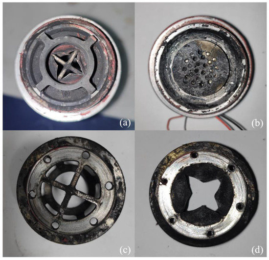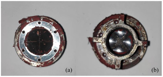 A post-test inspection of the motor revealed no damage to the motor casing. However, ablation of the support bracket was observed. Additionally, the metal diaphragm was found to be broken open, with no remnants of the diaphragm remaining within the motor. The metal diaphragm was subsequently removed and examined, revealing that it had fractured at the root, as depicted in Figure 18.