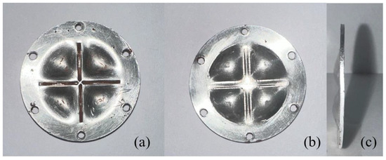 Metal diaphragm after the experiment: (a) pulse I view; (b) pulse II view; (c) lateral view.