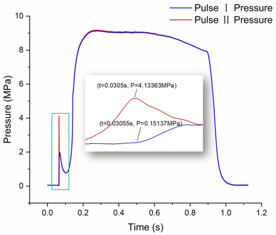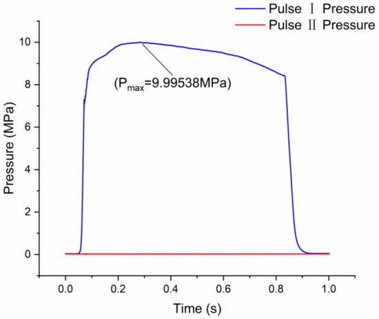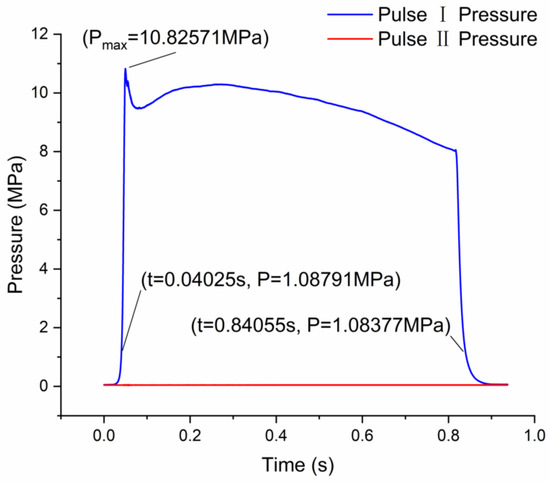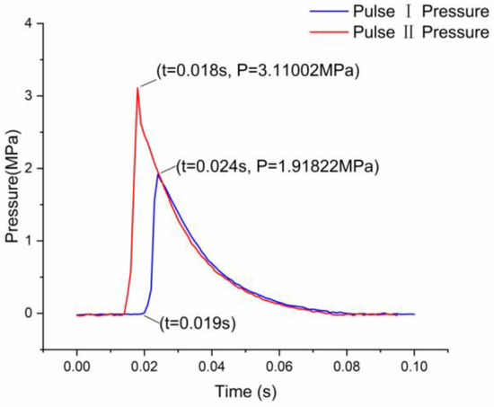 Figure 14 depicts the variation in pressure in the pulse I and pulse II chambers over time. The data show that the pulse II pressure reaches a peak value of 3.11 MPa at t = 0.018 s, after which it begins to decrease. Notably, the pulse I pressure starts to rise almost simultaneously with the pulse II pressure reaching its peak. At t = 0.024 s, the pressures in the I and pulse II chambers equalize at 1.91822 MPa, and they remain synchronized thereafter. The subsequent pressure decrease can be attributed to the small amount of ignition charge used. From the pressure curve, the opening pressure of the metal diaphragm can be determined as 3.11 MPa. This value is in close agreement with the simulation result of 3.3 MPa, with an error of only 5.7%. After the metal diaphragm is opened, the gas in the pulse II chamber flows into the pulse I chamber, resulting in a pressure balancing process between the two combustion chambers.