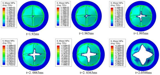 The stress distribution of the metal diaphragm during pressure loading is depicted in Figure 11. At t = 1.92 ms, the center of the metal diaphragm exhibits an initial fracture. Subsequently, the fracture propagates along the V-groove. The crack range expands progressively. By t = 2.0588 ms, the entire V-groove has completely cracked. The total duration of this cracking process is approximately 0.1388 ms. The average time at which the metal diaphragm is considered to have fully opened is t = 1.989 ms. Based on the applied linear load, the opening pressure of the metal diaphragm is determined to be 3.3 MPa.