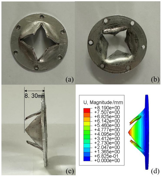 After the test, the motor was disassembled. The structures are shown in Figure 12. Inspection revealed no damage to the motor case. However, the ignition tool exhibited ablation. The overall structure remained intact. The metal diaphragm was cracked into four flaps along the V-groove, but the root was not broken. The metal diaphragm was removed from the separation device. Its deformation is depicted in Figure 13. As shown in Figure 13a,b, the metal diaphragm cracked along the V-groove. This is consistent with the simulation results presented in Figure 11. The absence of debris production indicates that the metal diaphragm broke open during operation of the pulse II motor. The pre-designed V-groove allowed the diaphragm to break in a controlled manner, generating less debris. Figure 13c,d provide a comparison between the test and simulation results for the side of the metal diaphragm. The maximum deformation of the metal diaphragm after the test was measured to be 8.3 mm. The simulation calculated a deformation of 8.19 mm, resulting in an error of 1.32%.