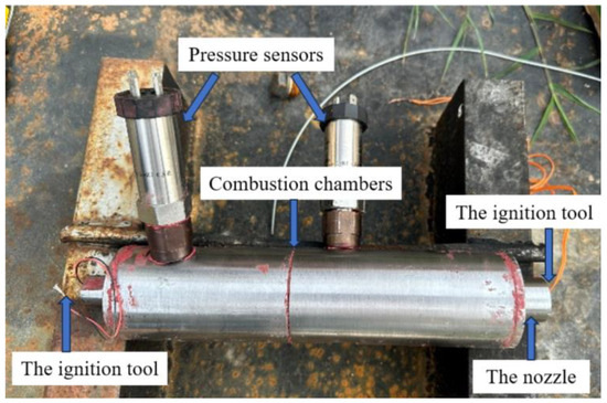 The experimental setup utilized a double-pulse motor, as depicted in Figure 1. Both combustion chambers were filled with propellant. Ignition tools were installed at both ends of the motor, and pressure sensors were positioned in each combustion chamber. The assembled motor is shown in Figure 15.