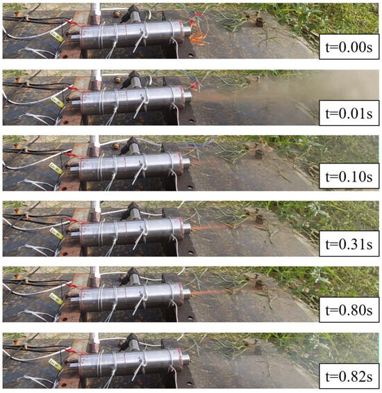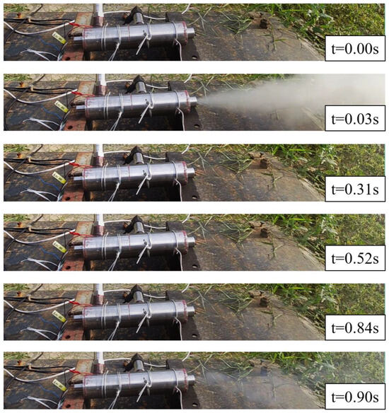 The power to the pulse II ignition device was then activated, with this event designated as the t = 0.0 s reference point. After a 0.03 s delay, a substantial volume of white smoke was observed emanating from the nozzle. This was followed by a flame spray within the nozzle. At t = 0.84 s, the flame disappeared, and a continuous white smoke discharge was noted from the nozzle. The complete sequence of events is depicted in Figure 17.