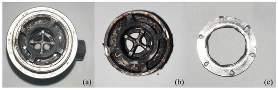 Components of the motor after the experiment: (a) the pulse II motor section; (b) the support frame; (c) the metal diaphragm.
