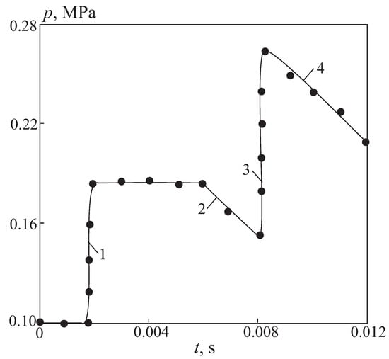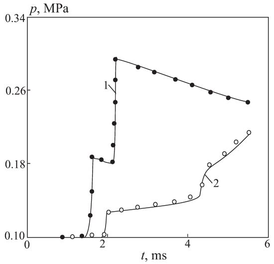 4] (symbols • and ∘). Pressure sensors 1 and 2 are represented by line 1 and • and ∘ icons, respectively. As compared to the experiment, the pressure behind the transmitted shock wave is higher and the pressure behind the reflected shock wave is lower [