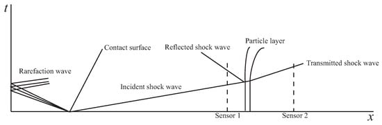 diagram of propagation of gas-dynamic discontinuities. With an initial velocity of zero, the incident shock wave interacts with contact discontinuity, which separates the region of pure air from the region occupied by particles. The interaction creates two shock waves: (i) a transmitted wave that travels along the two-phase region before exiting into the pure air region, and (ii) a reflected shock wave that travels towards the inlet section.