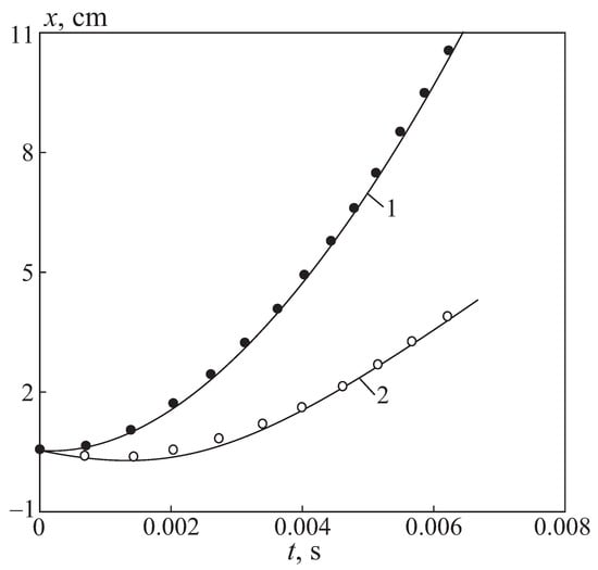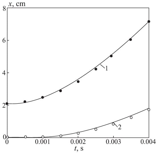 4] (lengths are given in meters, and scale is not observed). The initial coordinate of the shock wave front at time