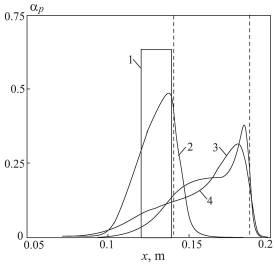 A vertical shock tube with a cross-section area of cm2 and a length of 6 m was considered. Under normal circumstances, the shock tube contained pure air () at normal atmospheric conditions. Air density was kg/m3, and air pressure was Pa. The air was in a stationary state () at the initial time. The tube inlet section was situated one meter away from the dividing partition. A 2 cm thick layer of particles was situated 3.055 m away from the dividing wall. The particles had a diameter of 1.5–2 mm and were solids made of either nylon ( kg/m3) or glass ( kg/m3). The particles were packed, and the volume fraction of air was 0.36. At the initial time, the particles were not moving.