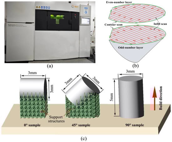 LPBF Ti6Al4V cylindrical specimens in 0°, 45°, and 90° build directions were fabricated. To maintain the structural integrity and printability of the 0° sample and the 45° sample, additional support structures were built, as shown in Figure 1c. After all samples were printed, the as-built samples were cooled in argon gas conditions to room temperature without any other treatment. The heat-treated samples were held at 800 ± 5 °C for 4 h and then cooled in argon gas conditions to room temperature.