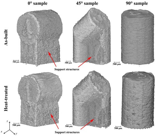 An X-ray CT modeled as ZEISS Xradia 520 Versa (Carl Zeiss Microscopy GmbH, Jena, Germany) was used to detect the porosity and defects of the LPBF Ti6Al4V titanium alloy in different build directions and heat treatment conditions. The reconstructed 3D samples are shown in Figure 2. A resolution of 5.89 μm per voxel was adopted to capture small-scale defects with 10 μm or larger diameter. Dragonfly software (Version 2021.1) [] was used to reconstruct the spatial distribution of AM defects. The defect volume, surface area, and defect coordinate were statistically analyzed and compared. The Feret diameter, derived from the distance of two tangents to the contour of a defect in a well-defined orientation, was measured to characterize the defect size. All statistical data were analyzed by Origin software (Learning edition, Version 2021 beta 1), and an R-square larger than 0.95 was considered statistically significant.