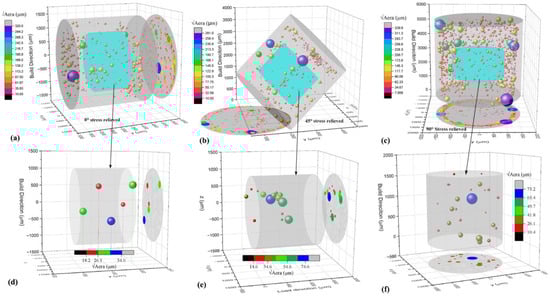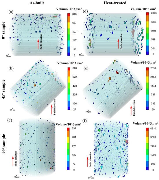 The defects of all samples were extracted, and the spatial distribution with respect to their volume is shown in Figure 3. The as-built samples are shown in Figure 3a–c, and the heat-treated samples are shown in Figure 3d–f. The maximum volumes of the 0° as-built sample and the 45° as-built sample are about 8.5 × 105 μm3 and 8.2 × 105 μm3, respectively, while that of the 90° sample is 5.3 × 105 μm3, much lower than that of the 0° and 45° samples. After the samples were heat-treated, the maximum volume of defect in the 0° sample and the 45°sample increased to 2.4~2.9 × 106 μm3, as shown in Figure 3d,e. The defect size in the 90° sample increased to 4.8 × 106 μm3, almost nine times that of the as-built one, shown in Figure 3f. The heat treatment can enlarge the defect size of the LPBF Ti6Al4V titanium alloy.