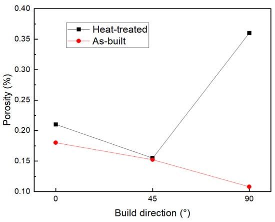 In Figure 4, the relationship between porosity and build direction is shown. The porosity of as-built samples ranged from 0.108% to 0.180%. When heat treatment is performed, high temperature can cause the coalescence of initial cracks into a bigger one and lead to higher porosity. The porosity of heat-treated samples ranged from 0.155% to 0.360%. It is particularly noted that the porosity of the 90° sample increased more than three times after annealing treatment, due to a large number of defects in the 90° sample.